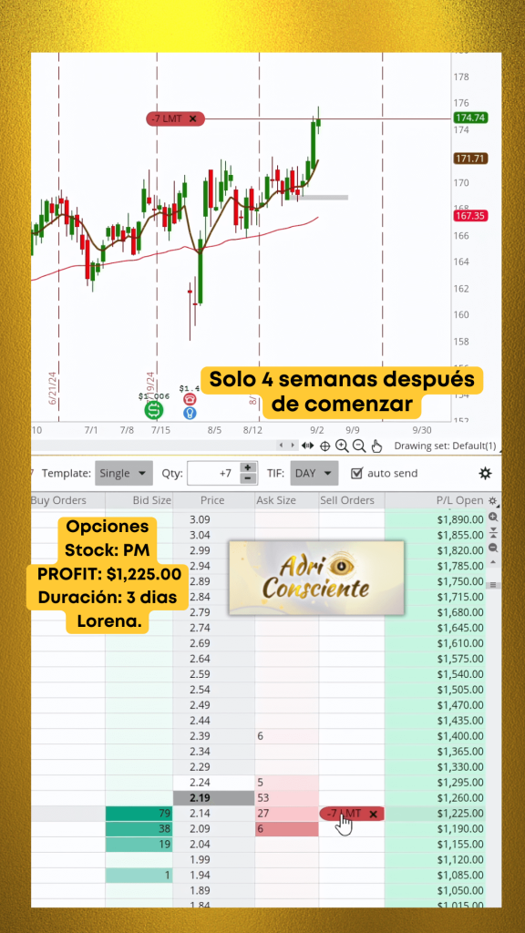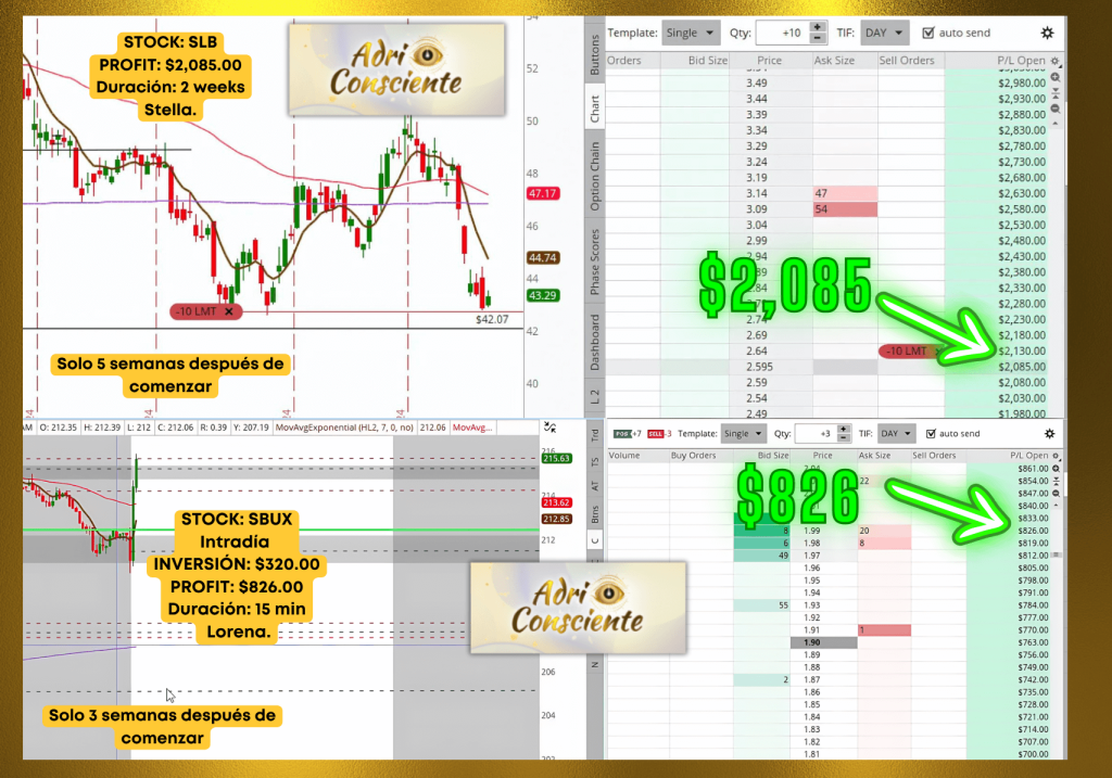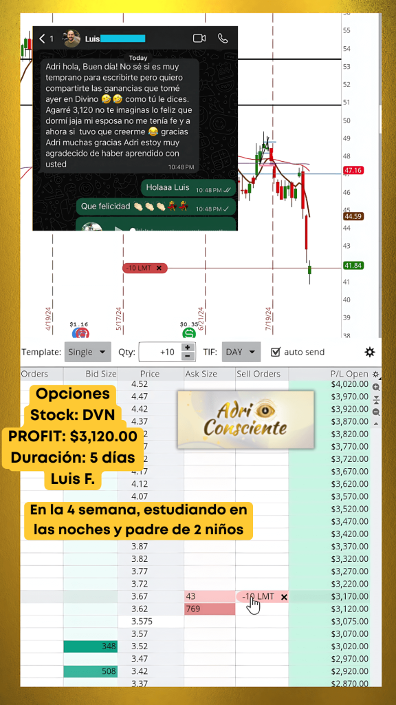“Adriana eres una mujer muy sabía y conoces muy bien los mercados, me encanta como explicas y la paciencia que tienes, yo cuando comencé sentía mucho miedo porque no sabía nada y todo al principio se veía muy complicado, pero despues de que me diste la plantilla y me mostrarste lo que tenía y me explicaste lo que tenía, yo despegue y ahora mirame de $80 dolares que comencé ganando ya he tenido varios trades de más de $1,000. Gracias Adri por tu constancia y por amar el trading y enseñar.”